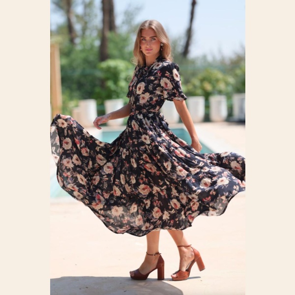 Nytt print på vakre Ambrosia fra Nectar. Denne kjolen er Nectar sin bestselger og ikke uten grunn. Den kler absolutt alle damer, og du kan bruke den både med og uten belte. Perfekt kjole både for en dag på jobb eller en kveld ute. Masse vidde i skjørtet, knapper i front, korte ermer med rysjer.