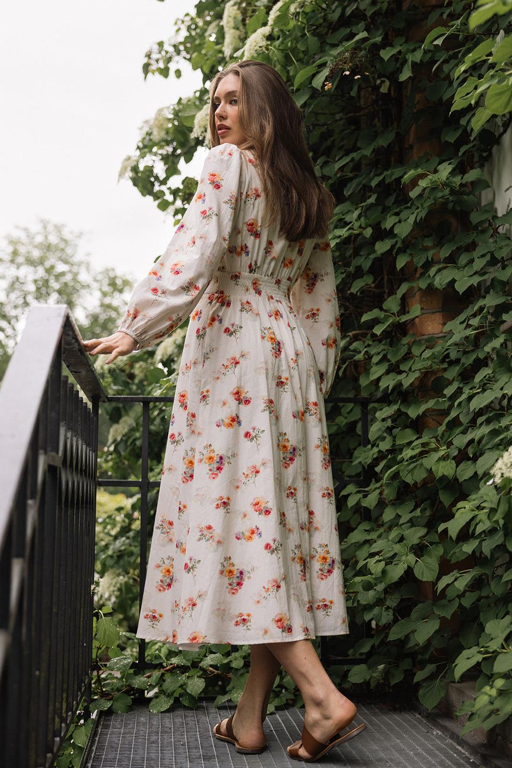 En romantisk og feminin kjole med et vakkert blomsterprint. Kjolen har flatterende omslagssnitt foran, markert midje og lange ermer med puff og srikk. Det er også strikk i ryggen, som gir en fin passform.