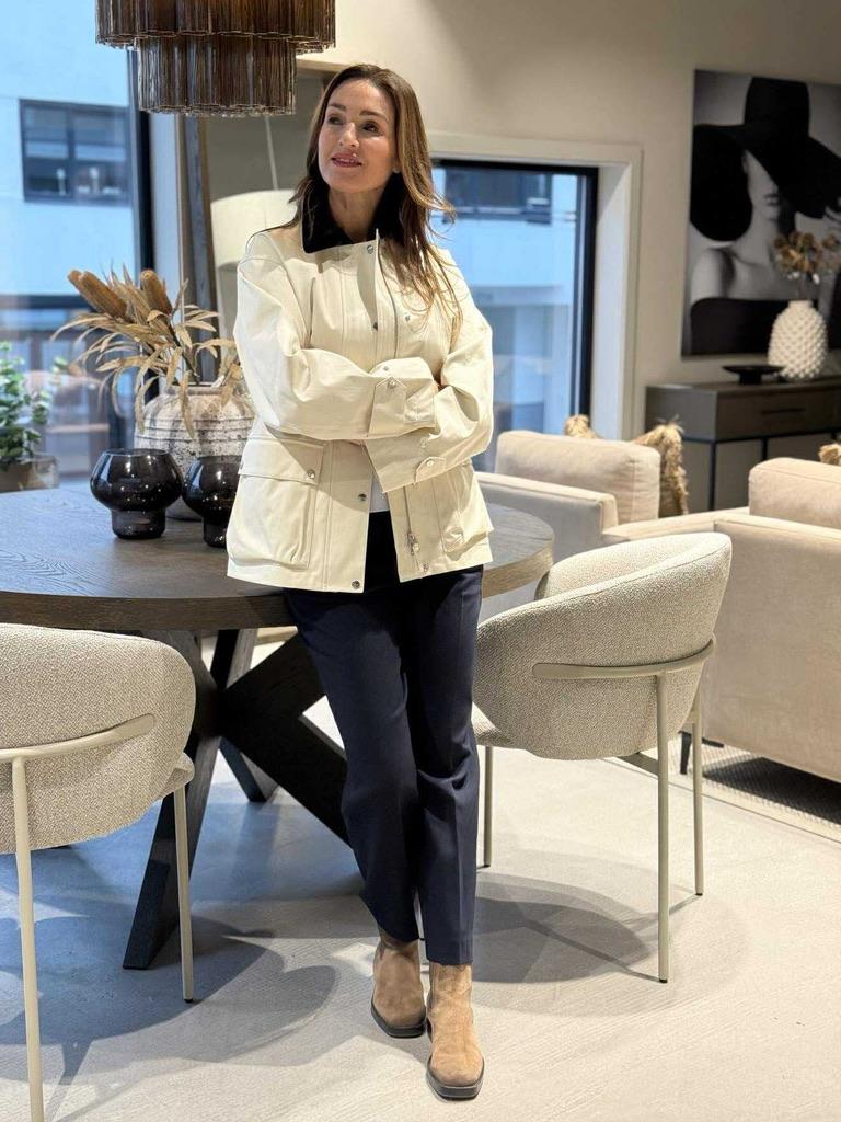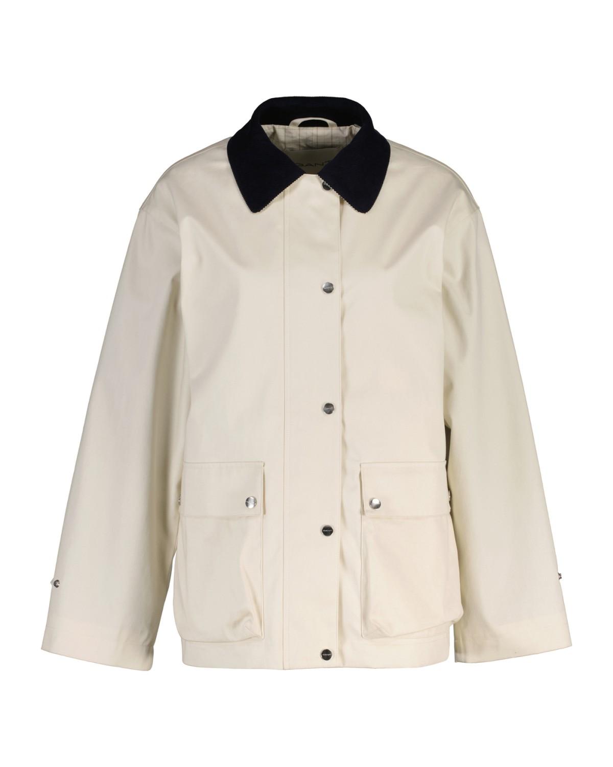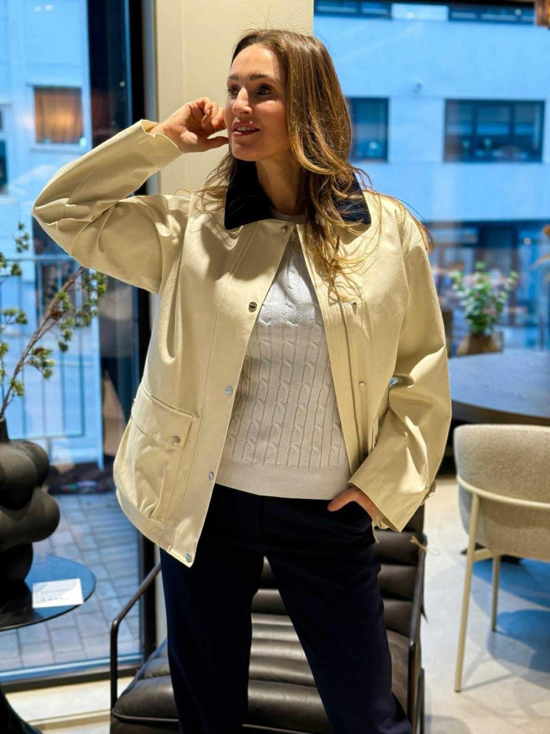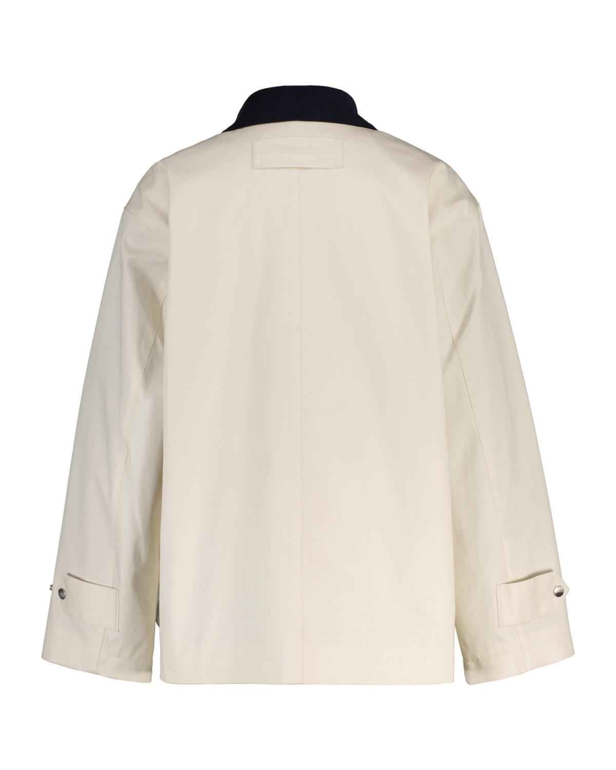 Denne jakken er mellomlang og er laget av bomull. Den har trykknappelukking, skjortekrage i cordfløyel, justerbare ermekanter og lommer med klaffer i front.