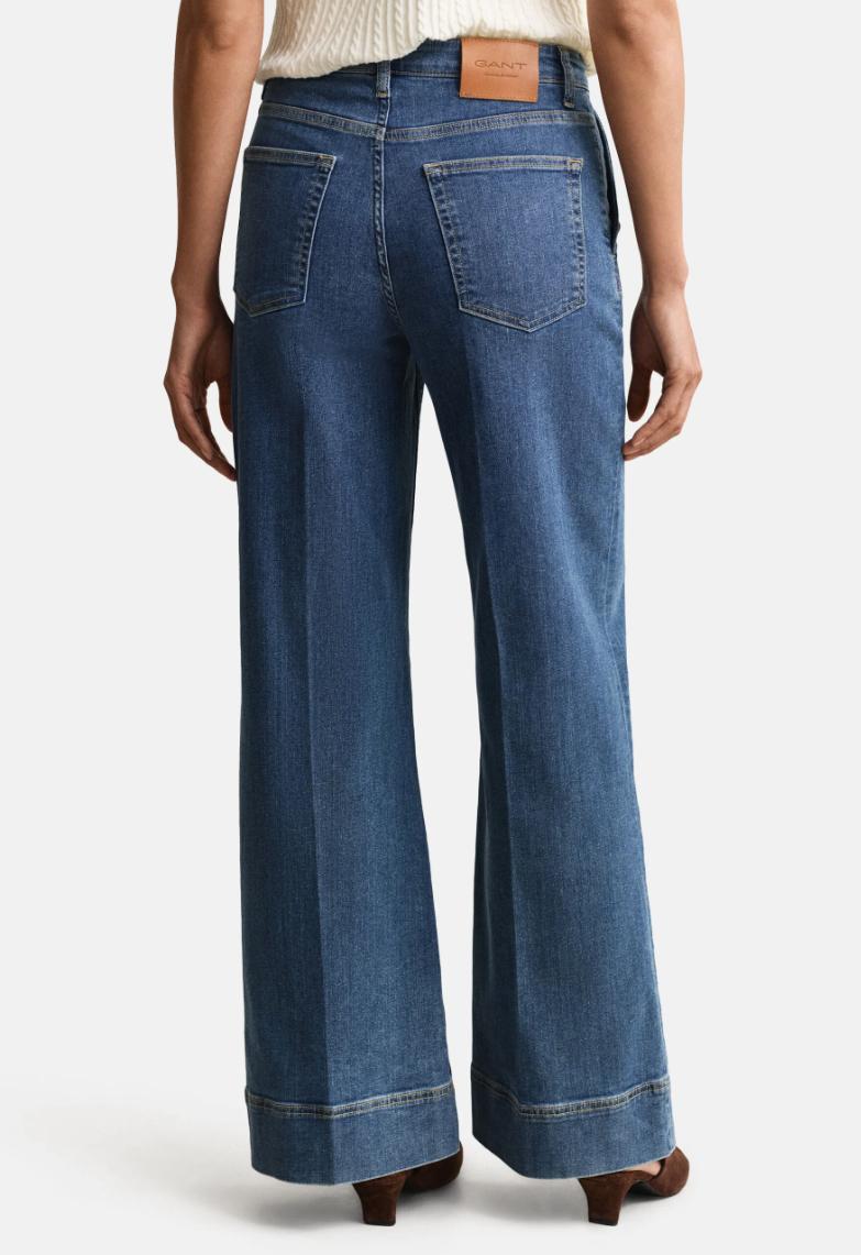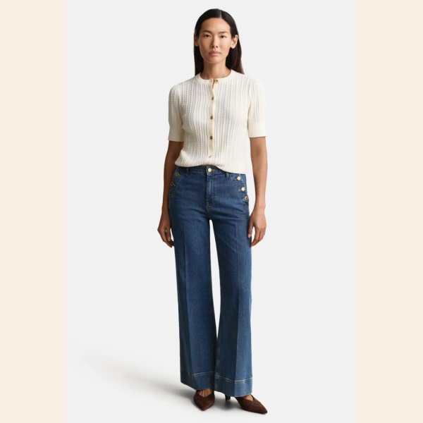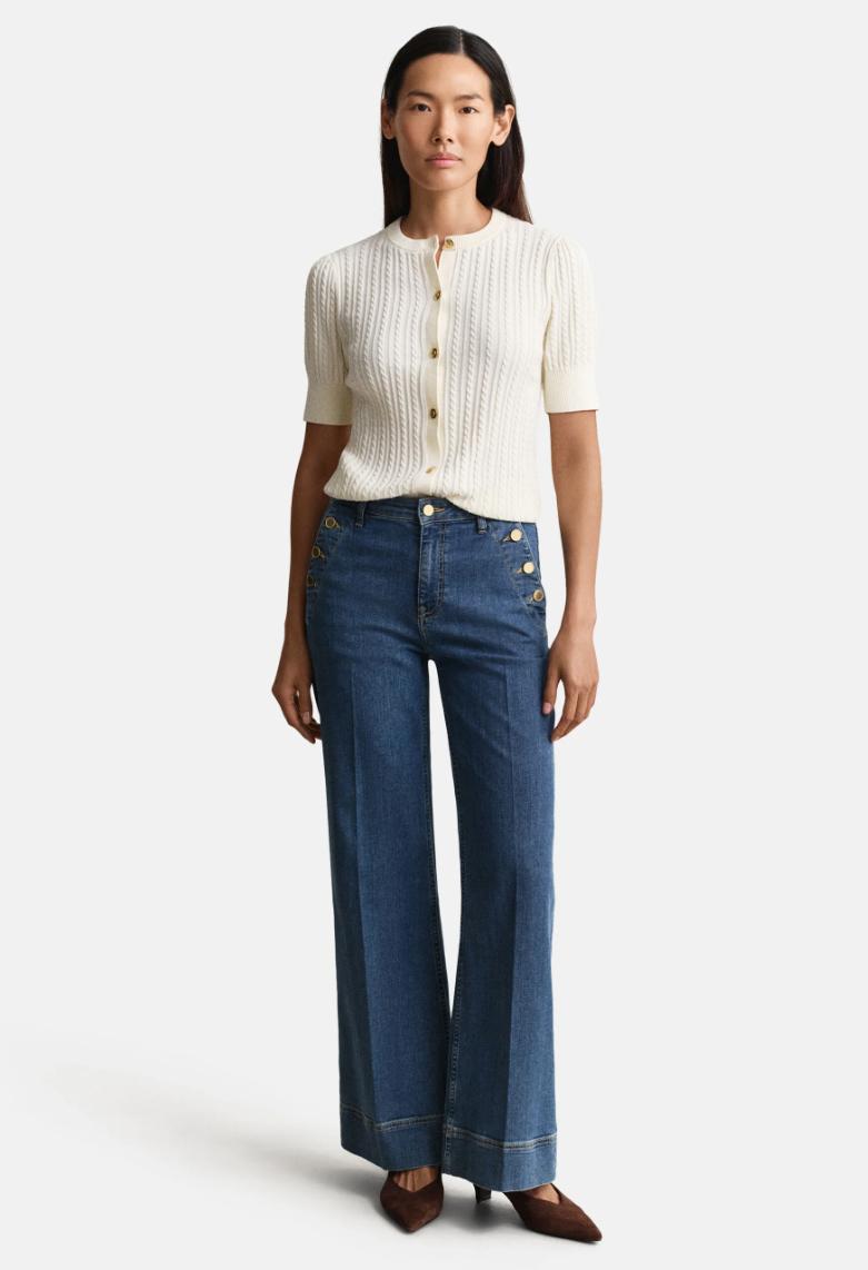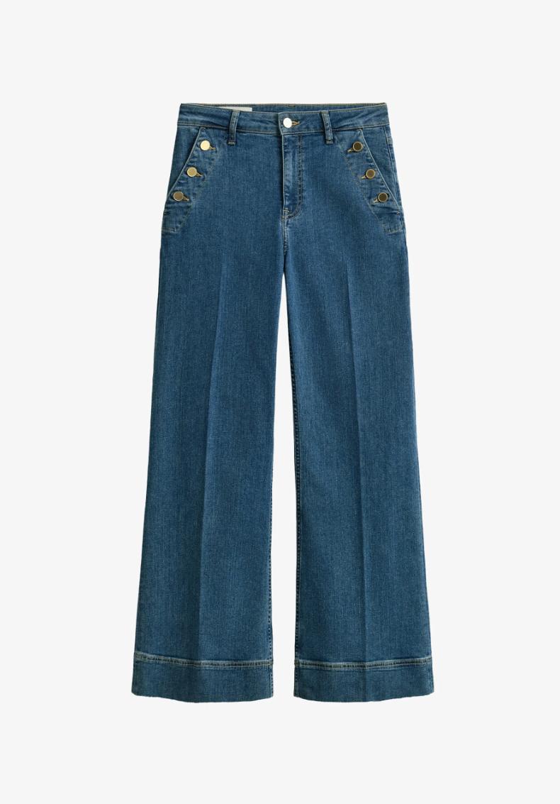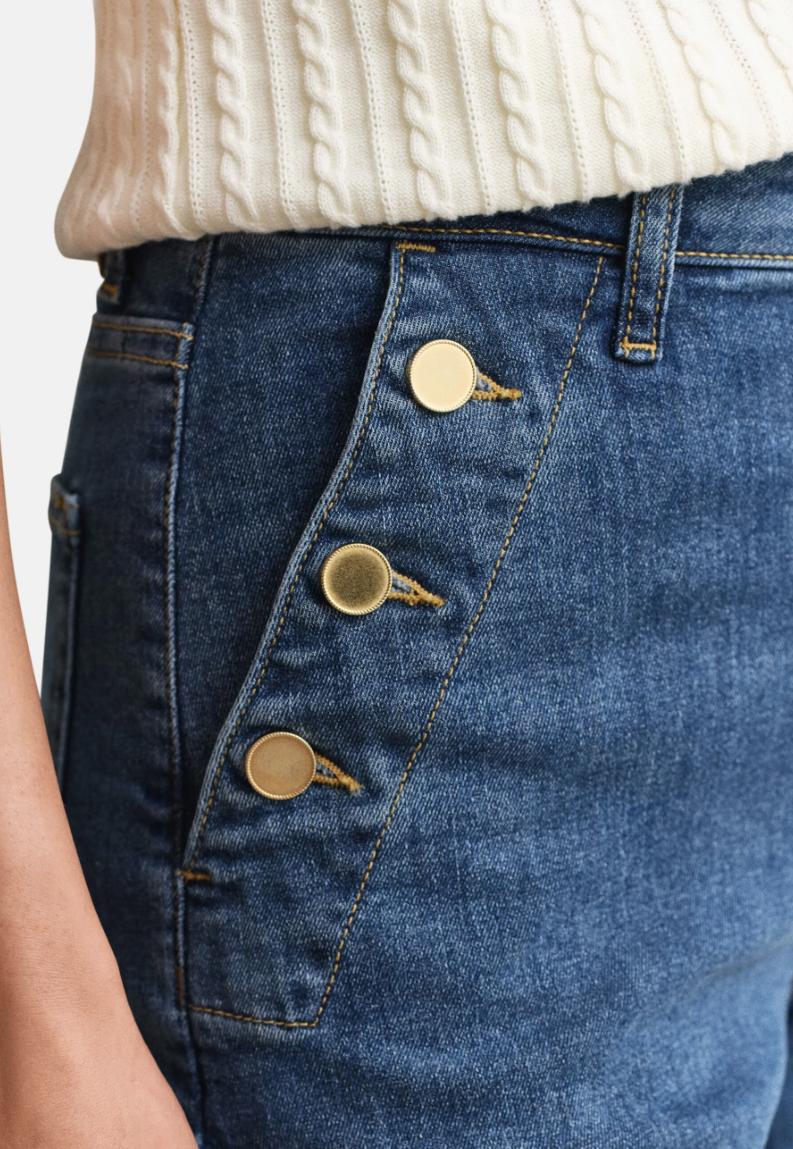Råtøff jeans med høyt liv og flare. Noe som gir en veldig fin silhuett. Det er flatterende gullknapper på lommene, og 2 baklommer. Skikkelig fin jeans med masse stretch.