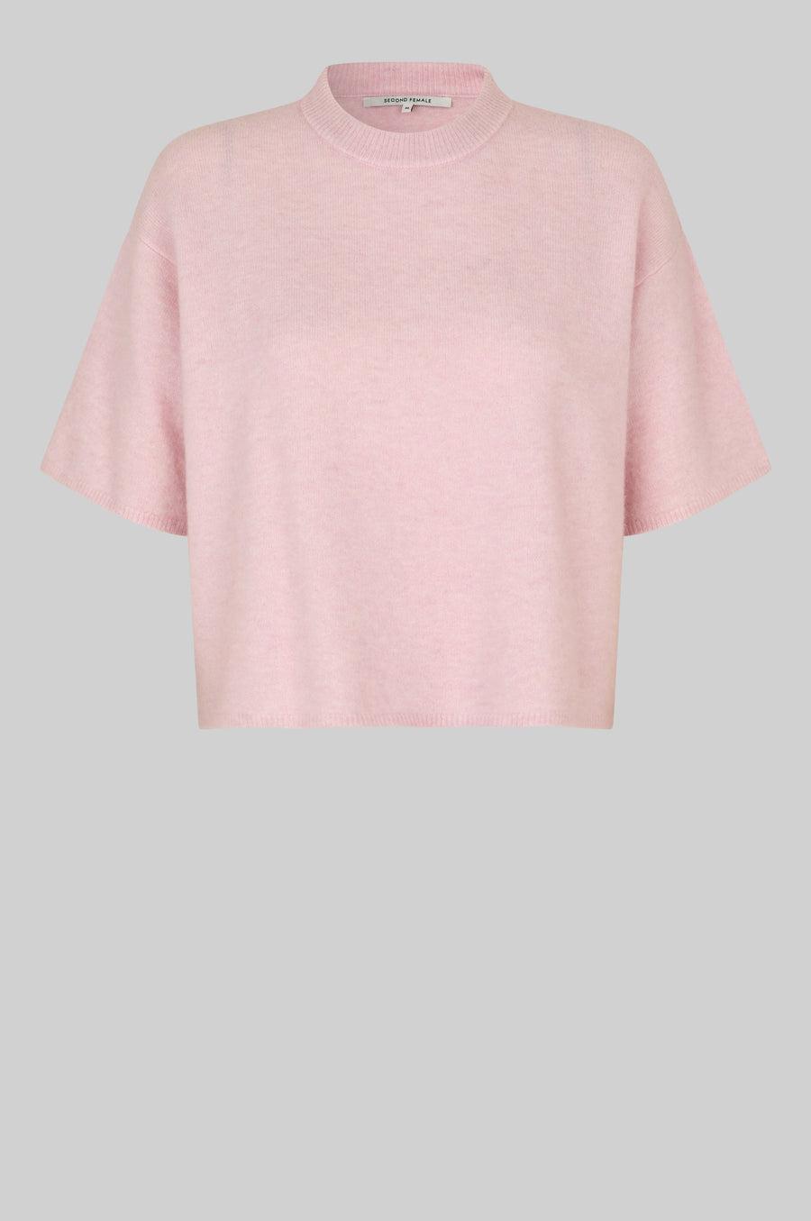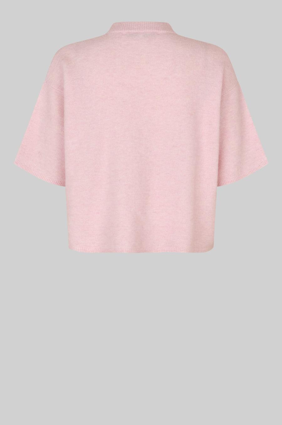 En super deilig og myk strikk med 3/4 ermer. Den har rund hals, senkede skuldre og korte, vide ermer. En nydelig rosafarge.