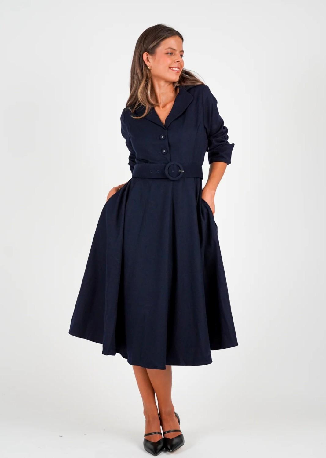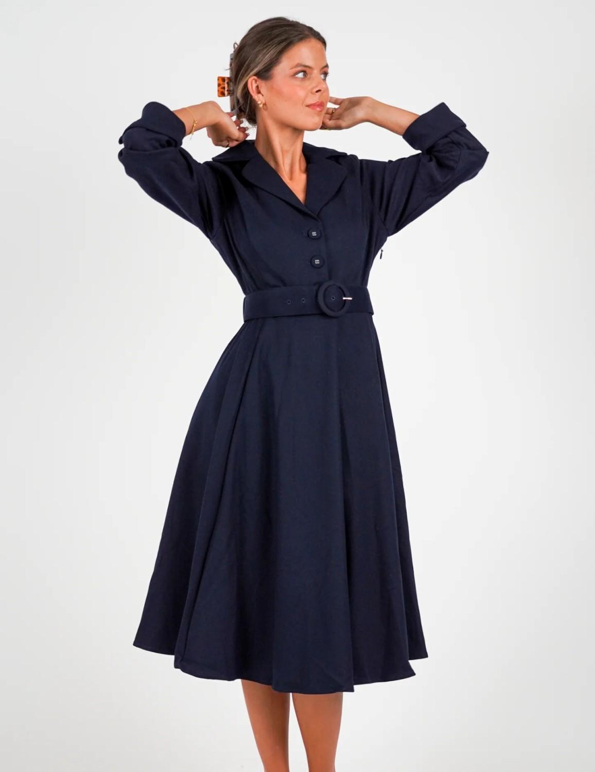Kjolen har en klassisk lengde som faller under kneet, 3/4 ermer med oppbrett og en tidløs krage. Det er skjult glidelås i siden, åpning i utringningen og et avtagbart belte.