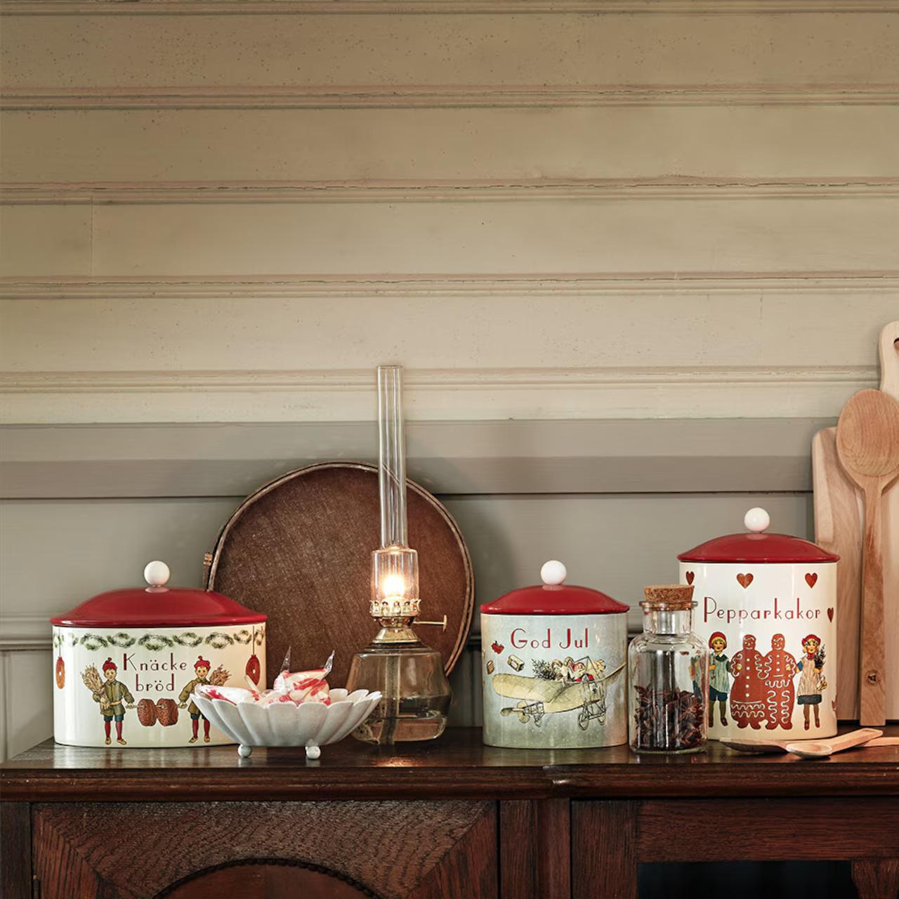En rund boks med lokk i metall. Perfekt til å ha julekaker eller julegodteri. Sett den på bordet eller en kjøkkenbenk for å skape en koselig julestemning.