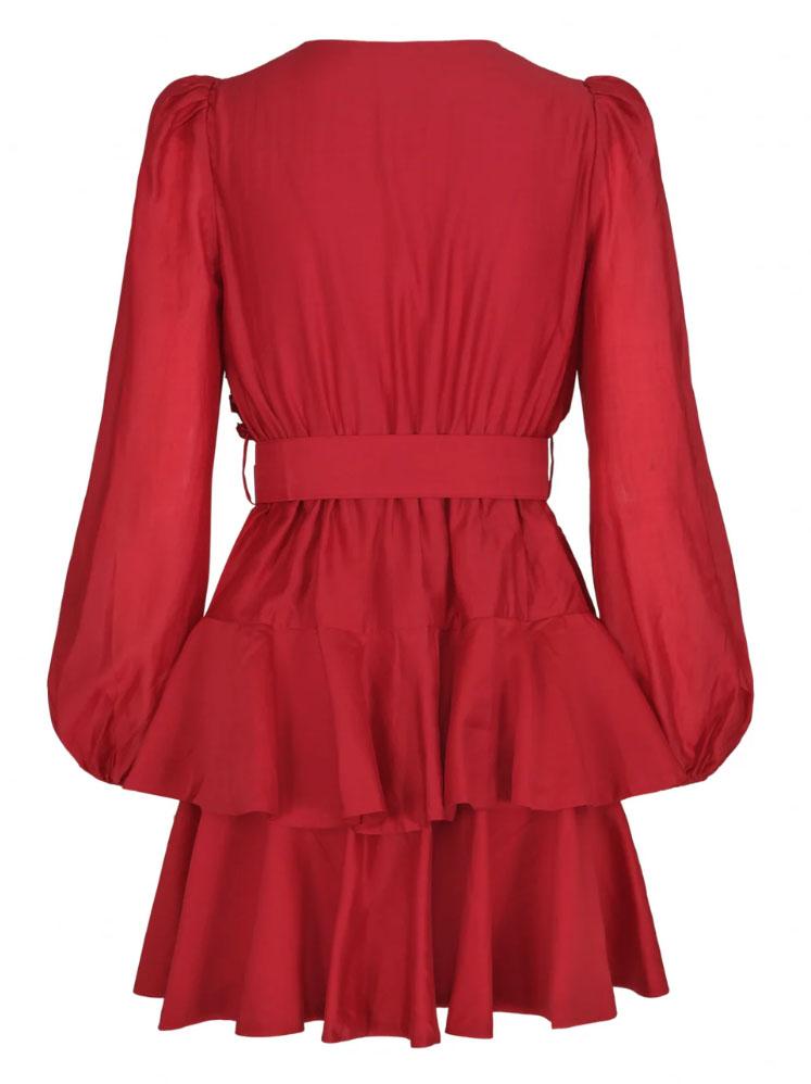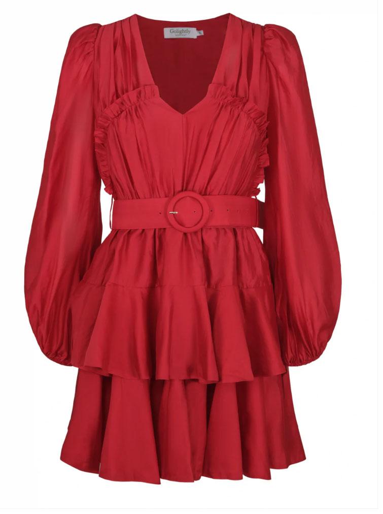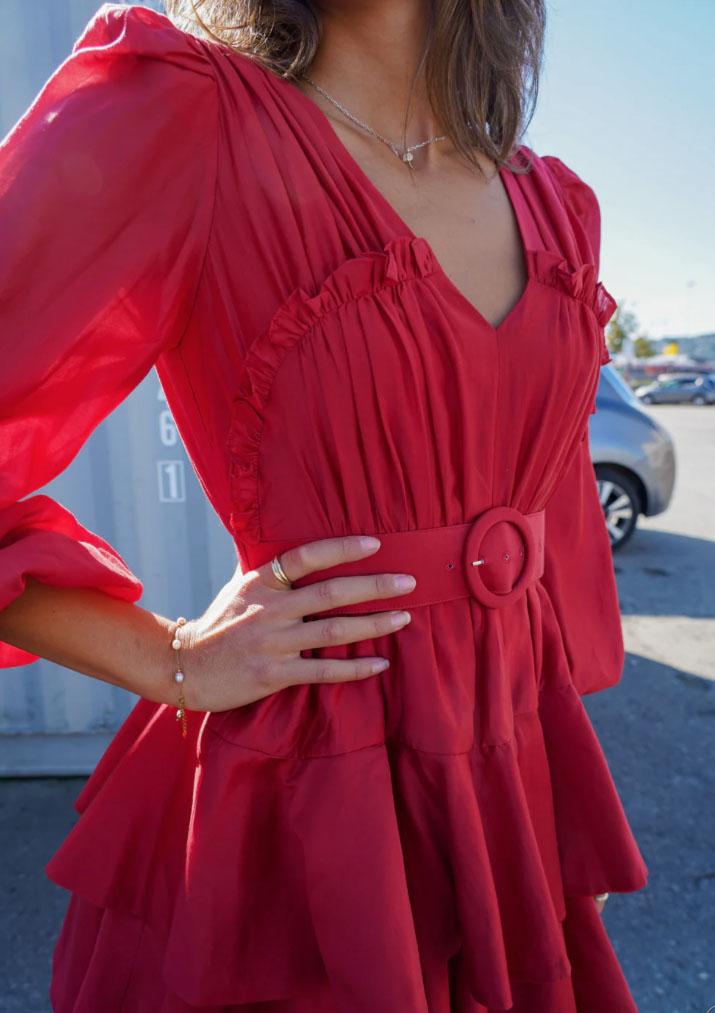 En rålekker kjole med et nydelig skjørt som har bølgeefekt og legger seg fint. Den har en liten rysjedetalje som går over brystet, lange ermer med strikk, liten puff på skuldrene og avtagbart belte.