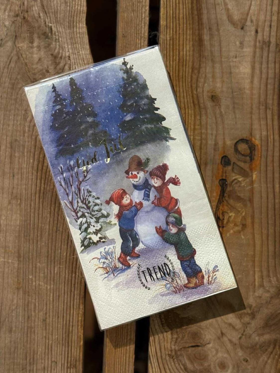 En skjønn serviett med et nostalgisk motiv av glade barn som leker i snøen sammen med en snømann. Et klassisk trykk som gir en varm og tradisjonell julefølelse.