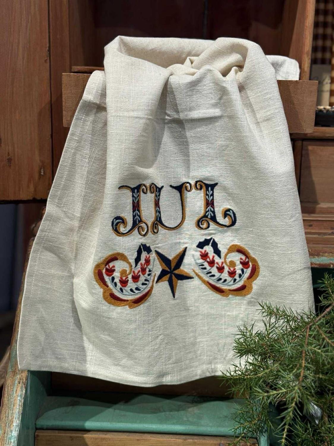 Et flott kjøkkenhåndkle i linfarget stoff med brodert ordet “JUL” i vakre farger, Det gir en varm og tradisjonell julefølelse. Et håndkle som både pynter og sprer juleglede på kjøkkenet.