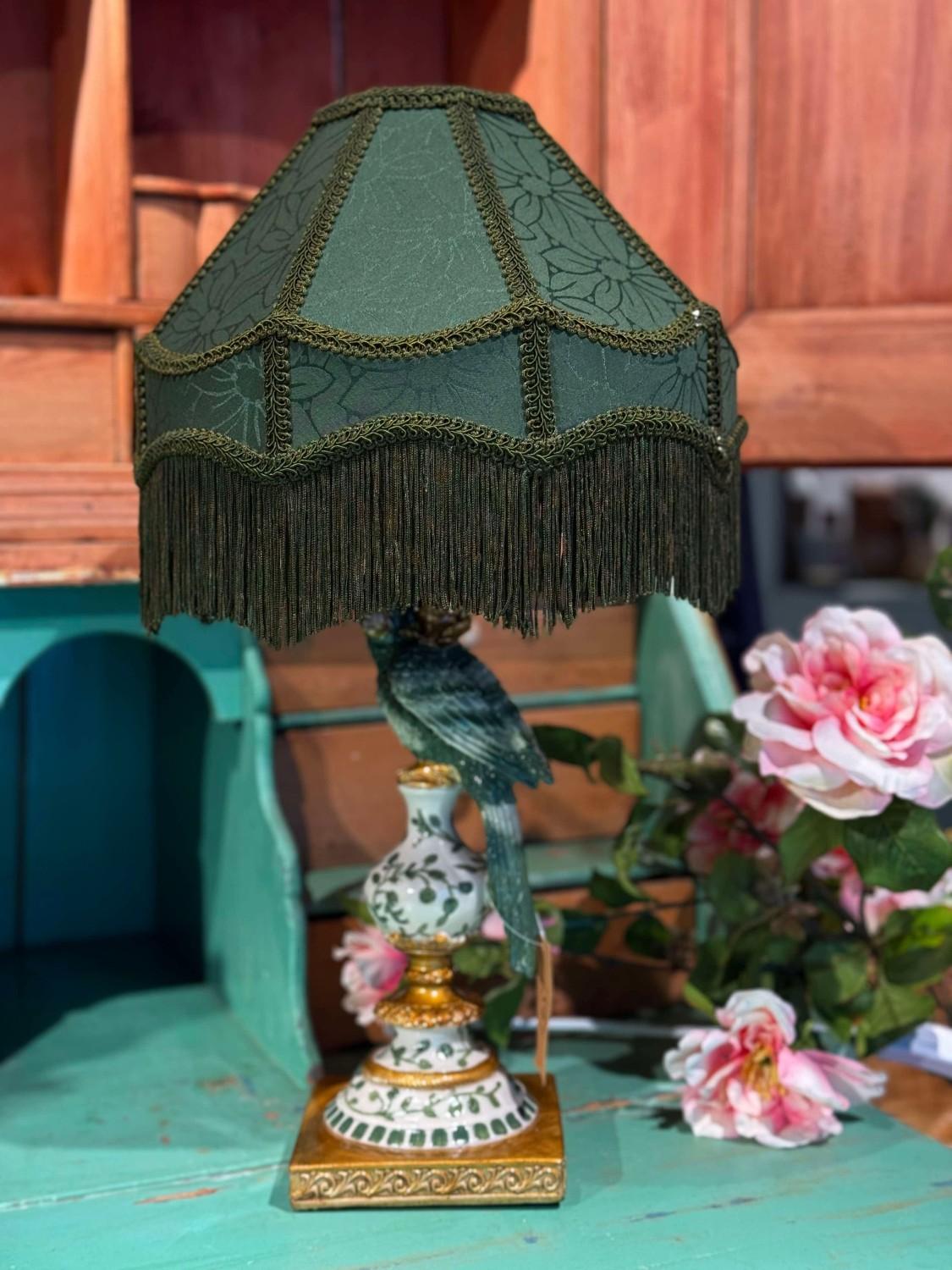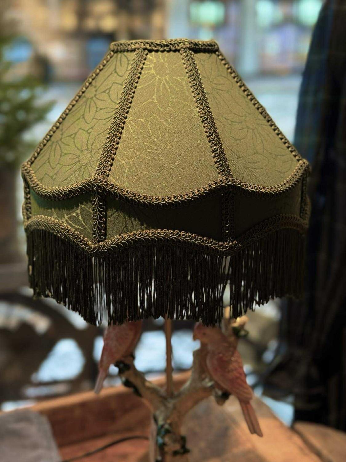 Grønn lampeskjerm med frynser, vakkert sydd kantbånd og ton in ton mønster. Lampeskjermen har en vendbar holder, noe som gjør at du kan bruke den både til bords og taklamper.