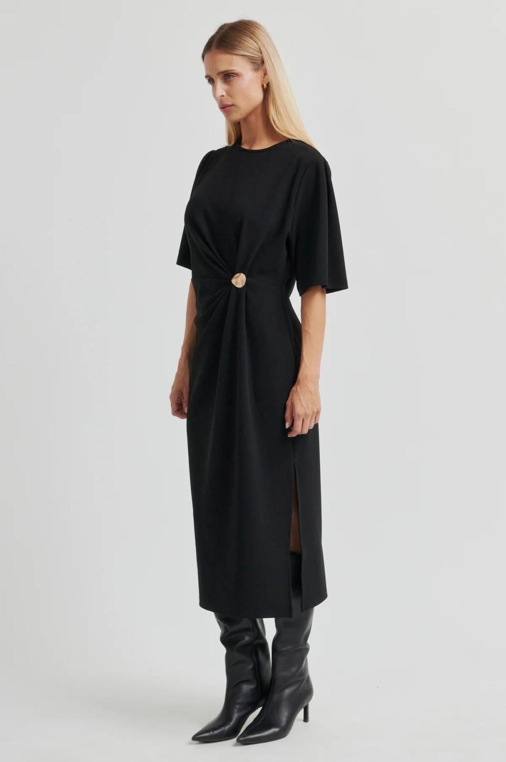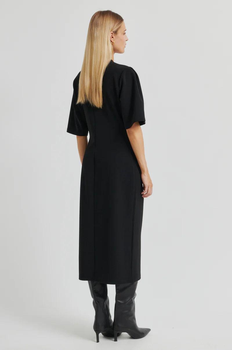 Drapert lang kjole fra Second Female. Kjolen er laget i mykt, stretchy stoff. Den har rund hals med skjult glidelås bak. Gulldetaljer i midjen med drapering. Splitt i den ene siden og en lett tettsitende silhuett.