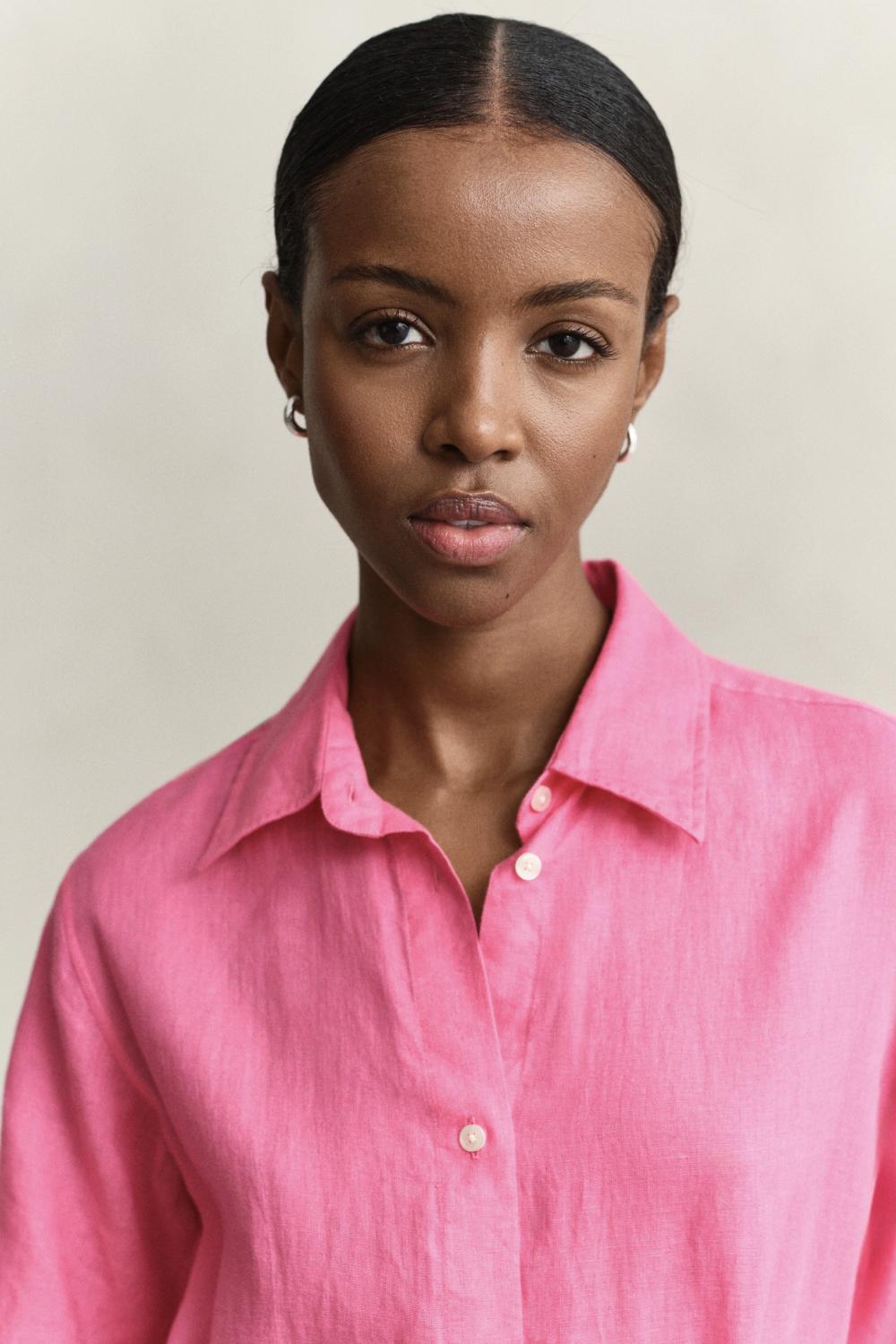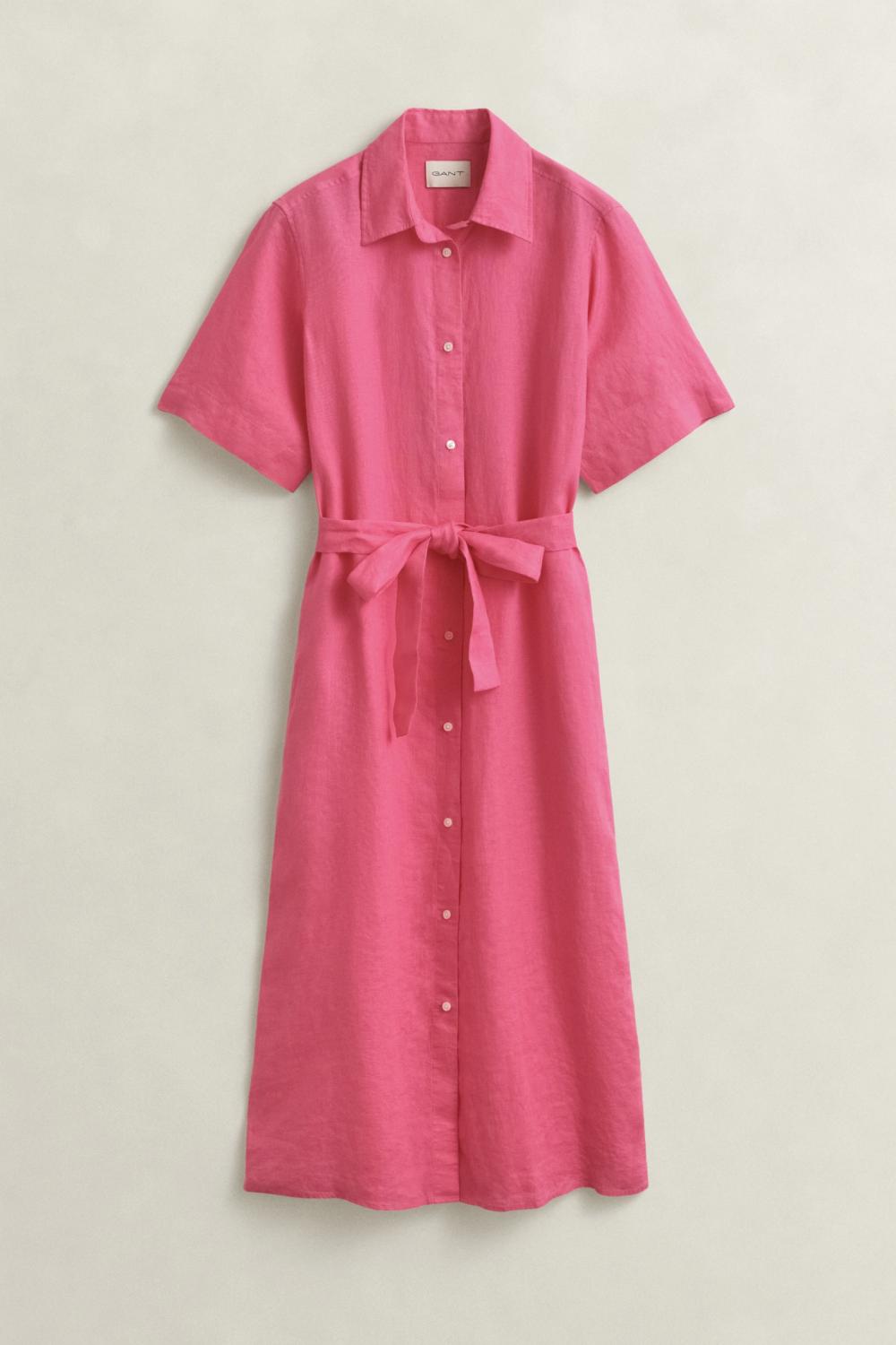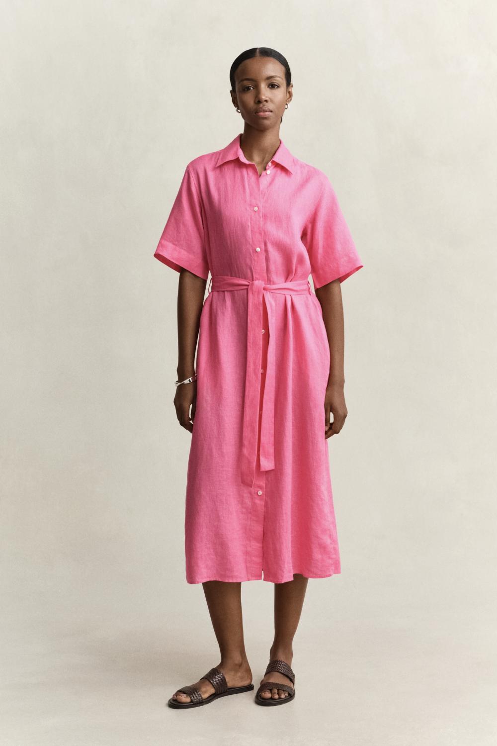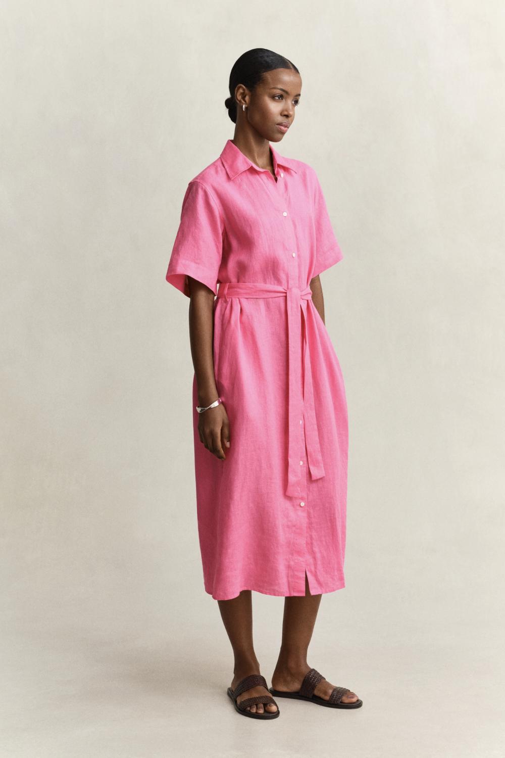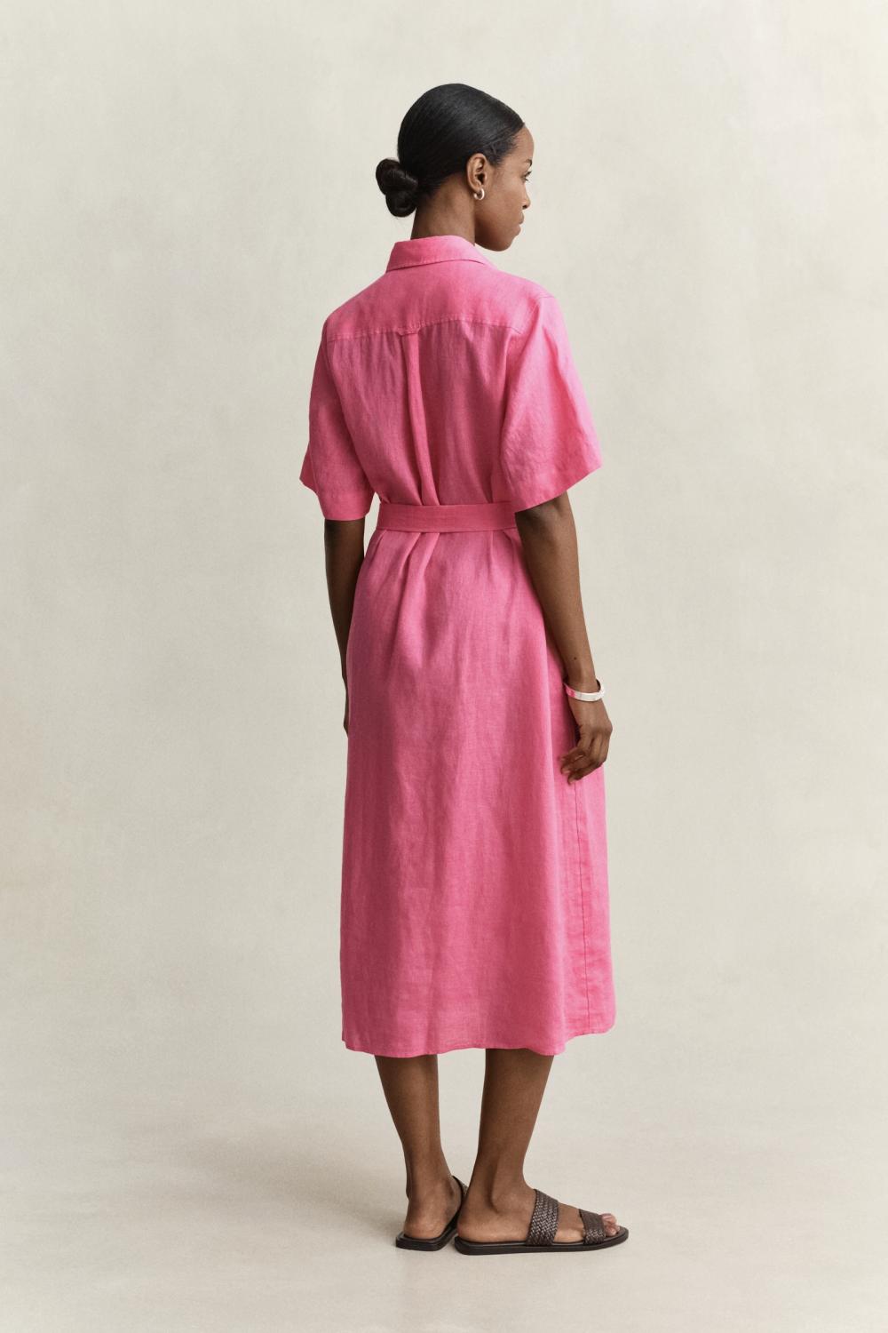 En kjole som er laget i sertifisert europeisk lin, en lett og pustende kvalitet. Denne stuperfine rosa linkjolen har en normal passform med en midt på leggen lengde. Den har skjorte krage, avtagbart knytebelte, lommer og knapper hele veien i front.