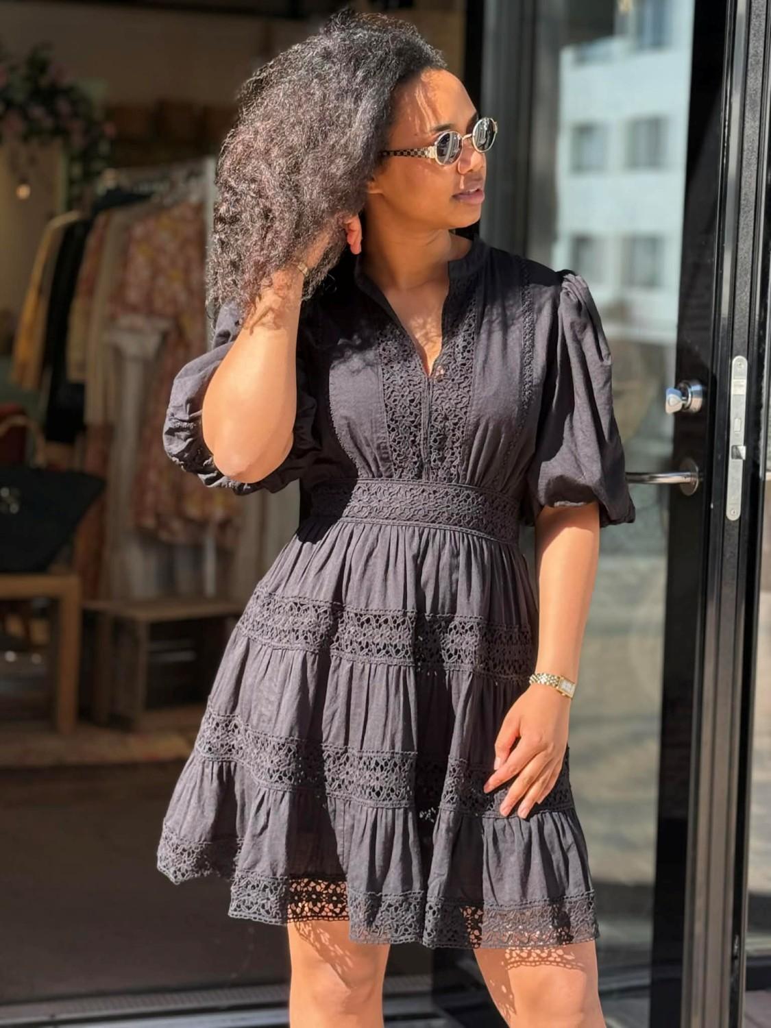 En feminin minikjole i deilig bomull. Kjolen har blonder overalt og har en romantisk stil. Det er volumiøse puffermer, flatterende v-hals og en definert midje. Perfekt for sommerfest og ellers andre spesielle anledninger.