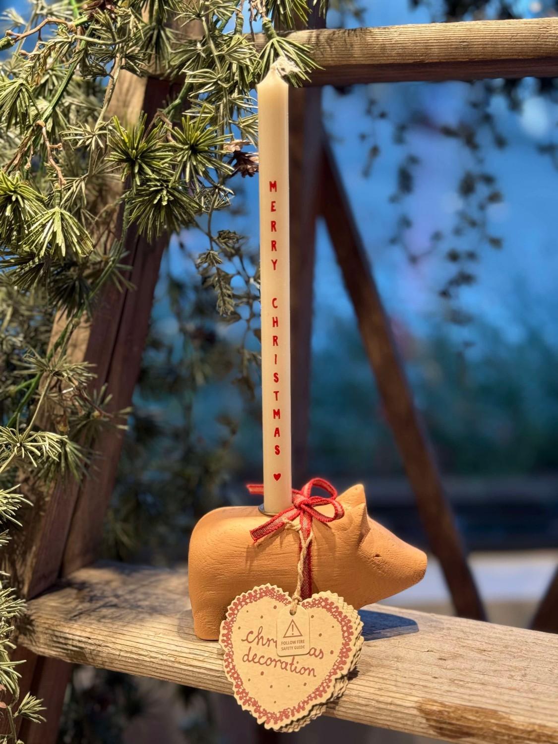Skjønn lysestake av en gris fra danske Maileg. Den har en sløyfe rundt magen. Og du kan brenne et kertelys eller juletrelys.