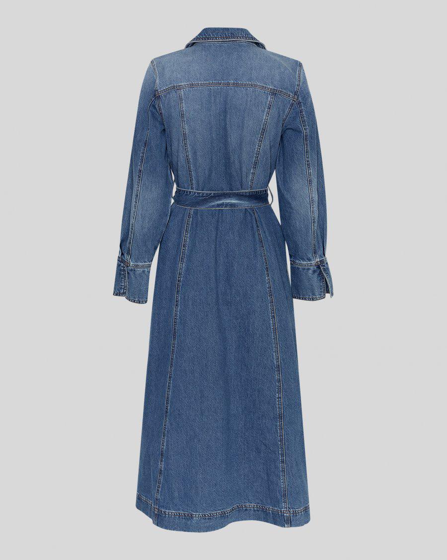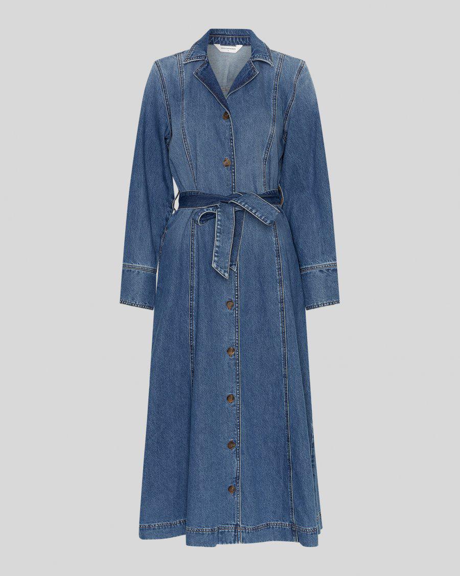 En lang skjortekjole i klassisk stil med skjortekrage, knappelukking i front hele veien ned, mansjetter, avtagbart belte i livet og lommer i siden.