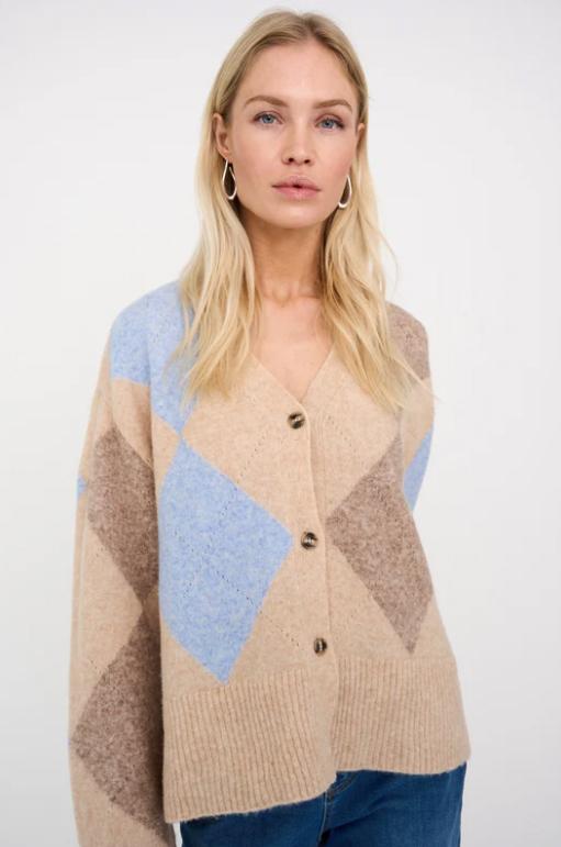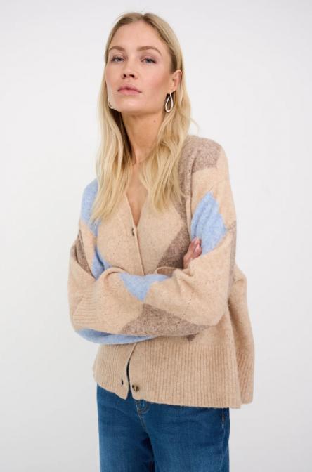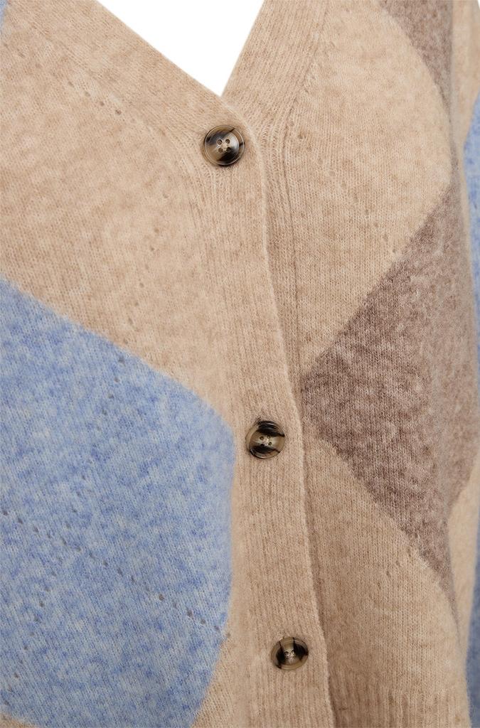 Fin strikkejakke med argyle mønster i vakre farger som passer like fint til en jeans som til en linbukse. Den er spunnet av en myk, mellomtung strikkekvalitet og har en avslappet passform med dyp V-hals.