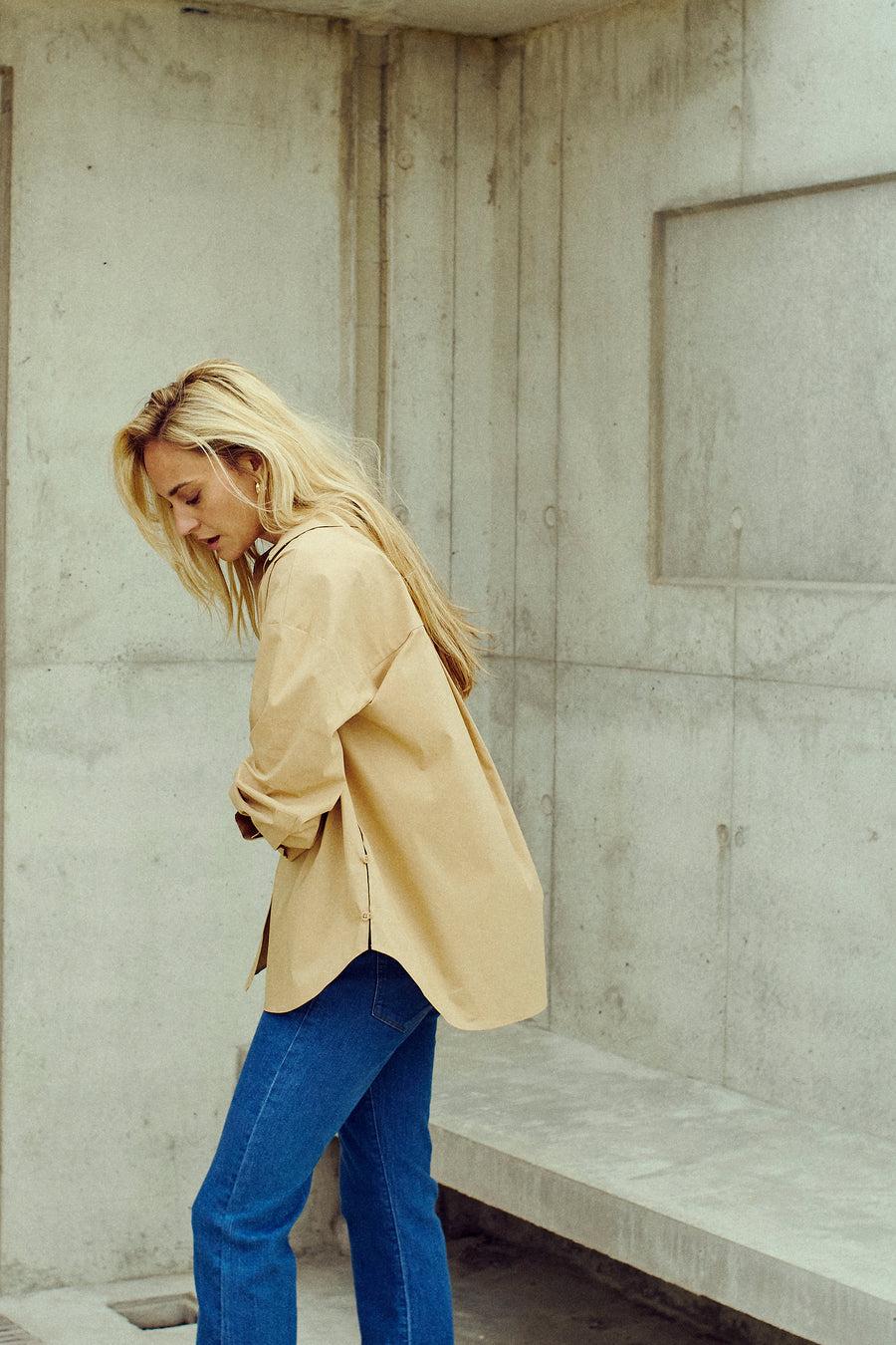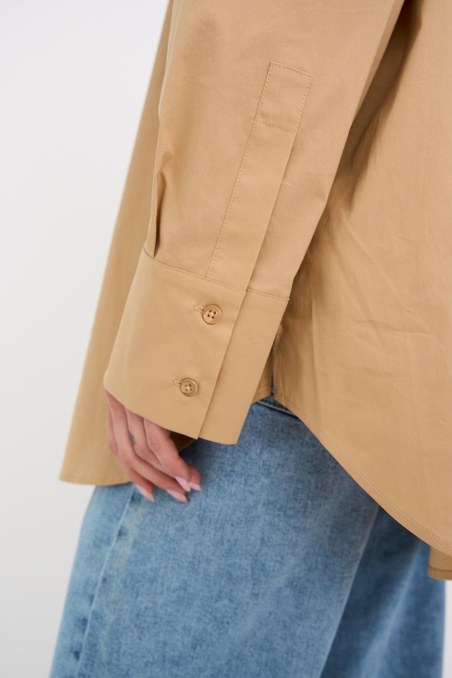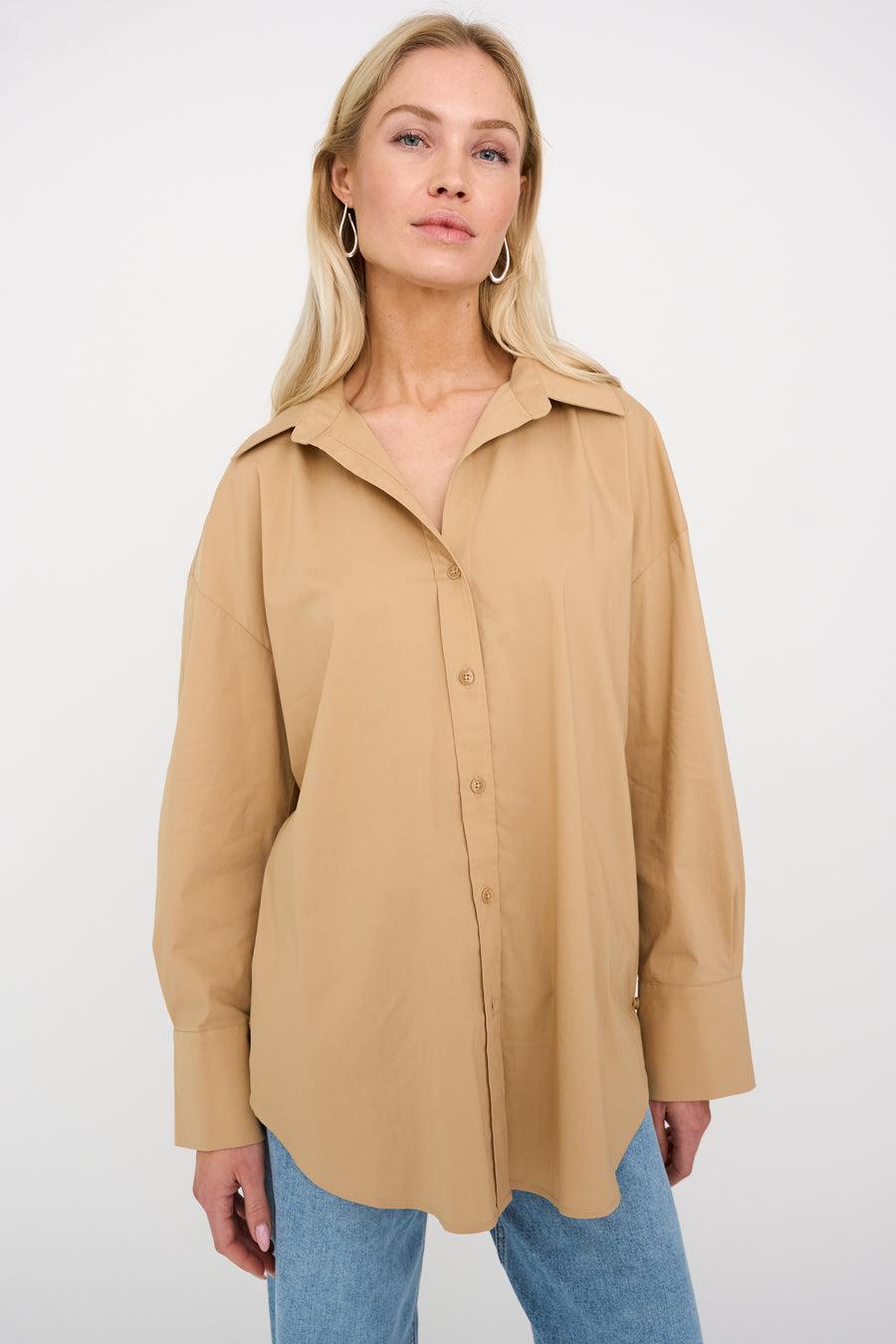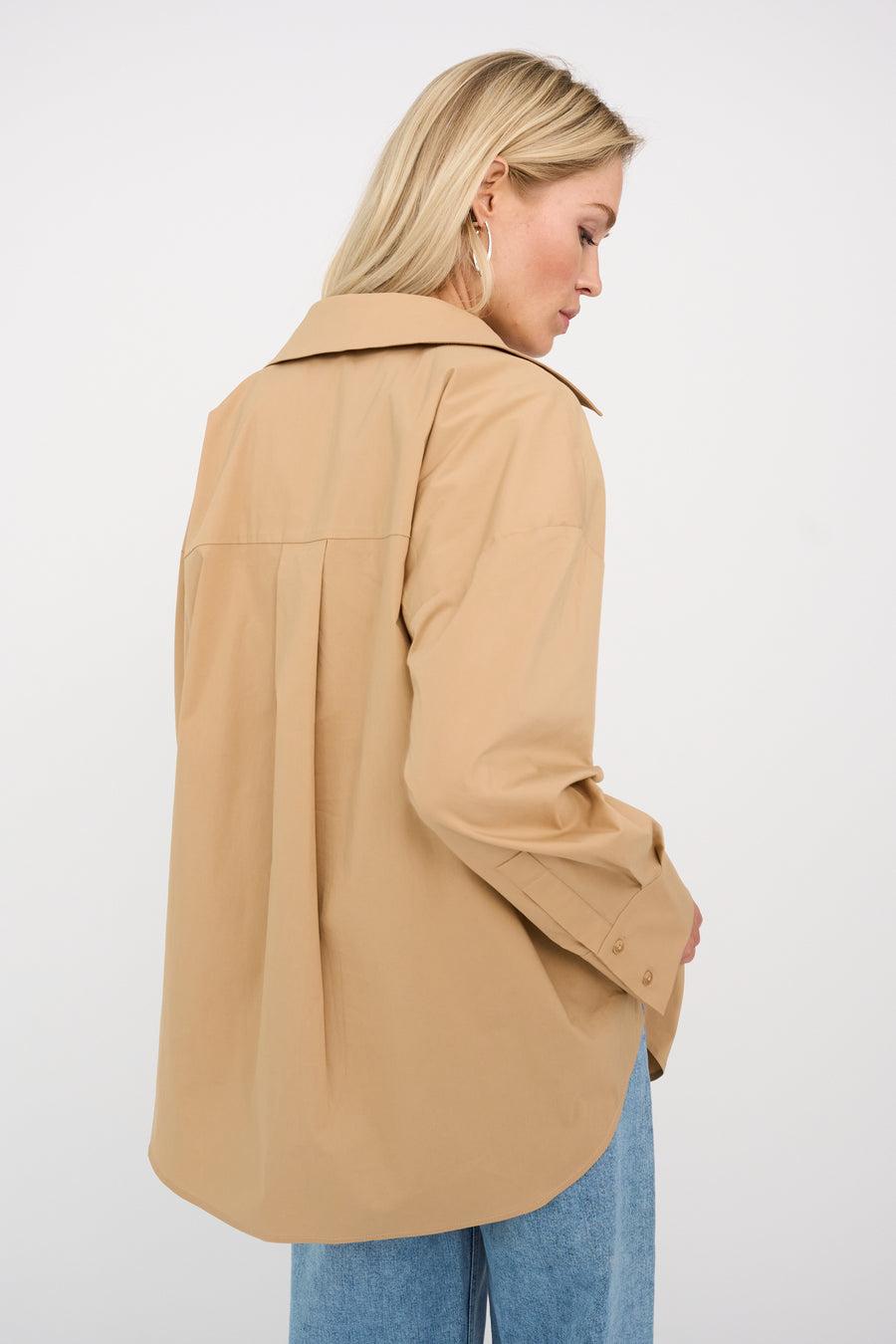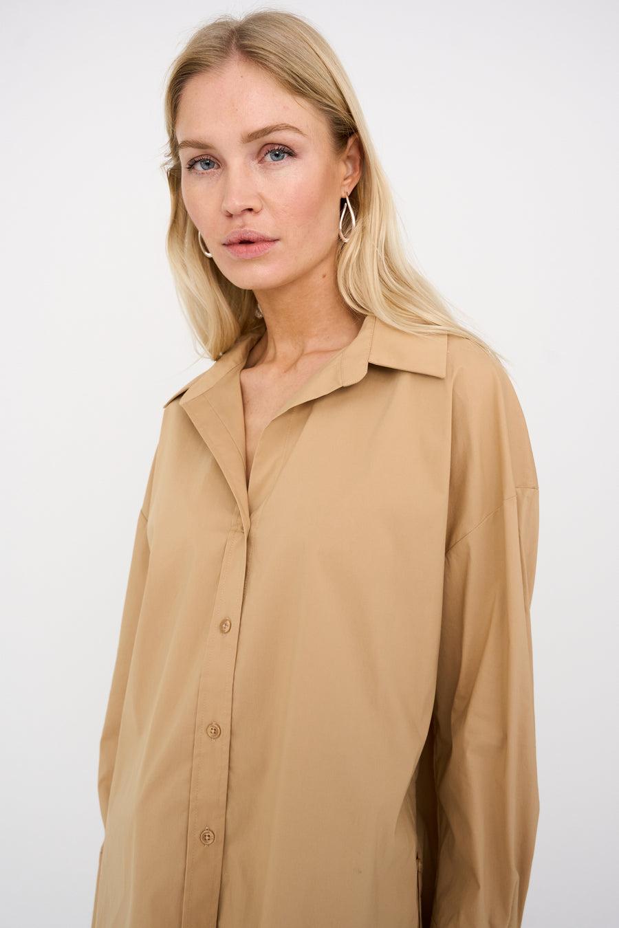 En stilig oversized skjorte med klassisk krage, myke skuldre, overdimensjonerte mansjetter og knappedetaljer på siden.