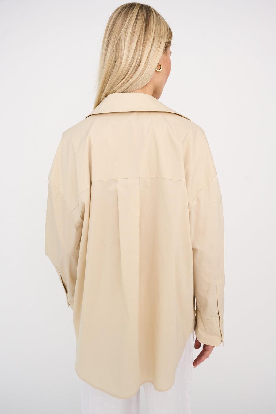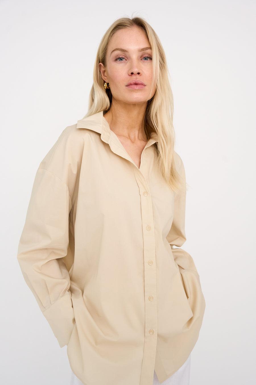 En stilig oversized skjorte med klassisk krage, myke skuldre, overdimensjonerte mansjetter og knappedetaljer på siden.