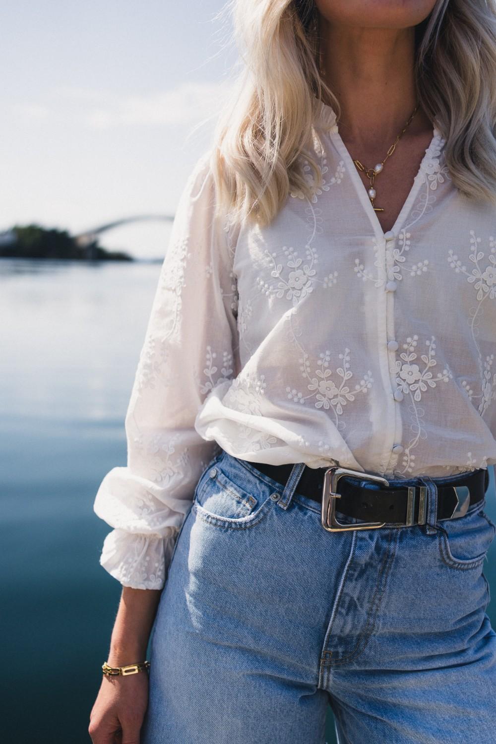 En vakker og feminin bluse med klassiske detaljer. Blusen har en flatterende V-hals og lange ermer med blondedetaljer. Den er laget i en lett og myk bomullskvalitet med ton i ton broderier av blomster. En sommerlig og fin bluse som passer like fint til en olashorts som til et skjørt.
