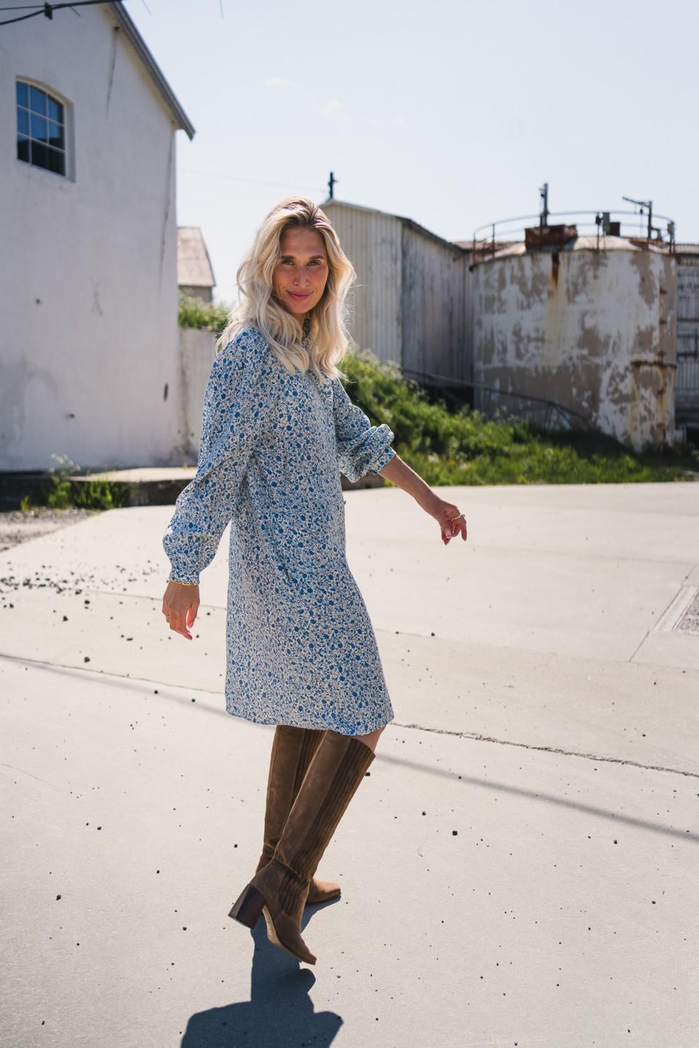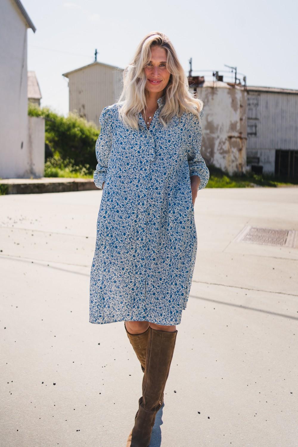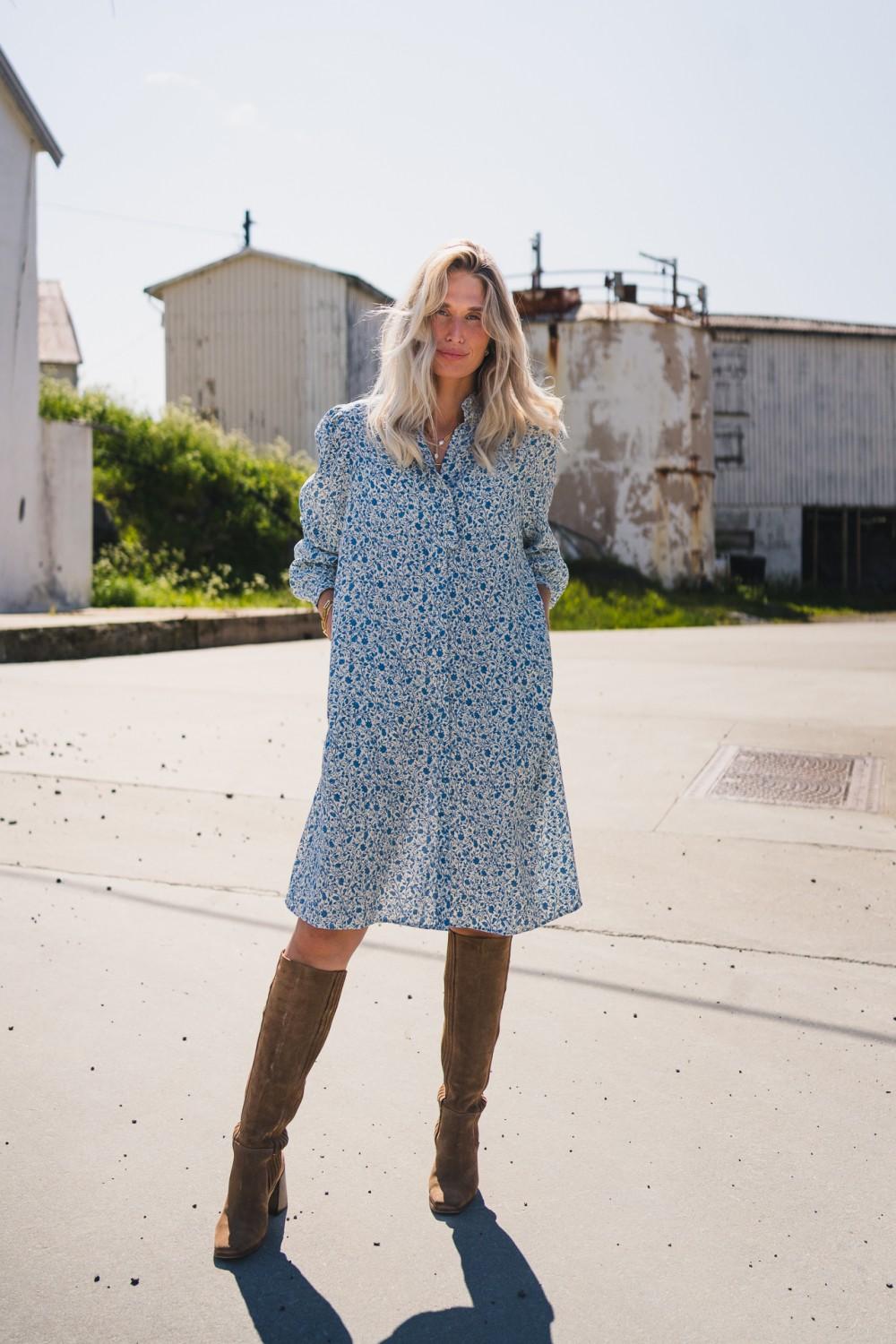 Den perfekte sommerkjolen i deilig viskose med et vakkert blomsterprint. Denne kjolen har lange ermer, avtagbart belte, prestekrage med volanger, lommer og er laget i en veldig myk og behagelig kvalitet.