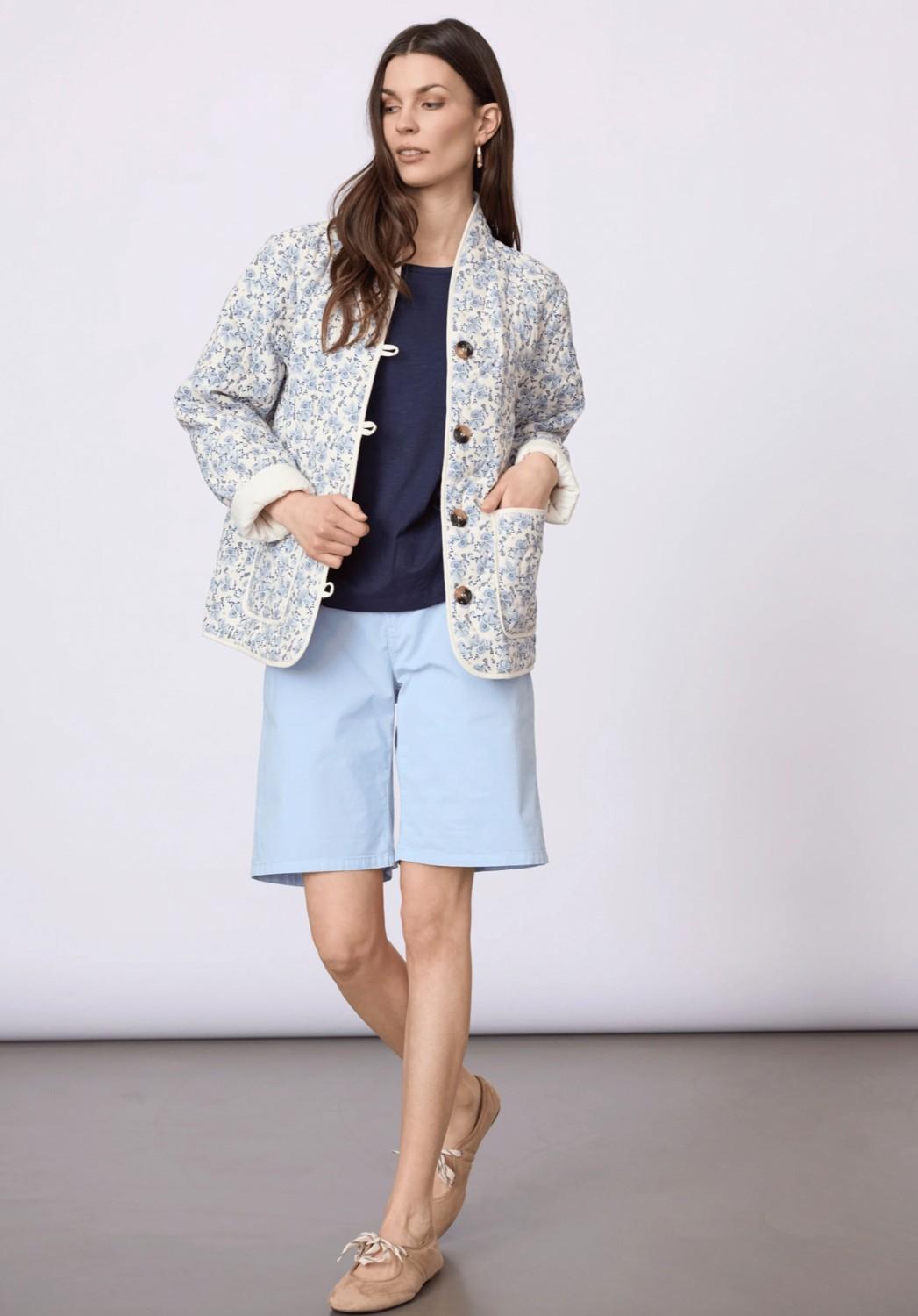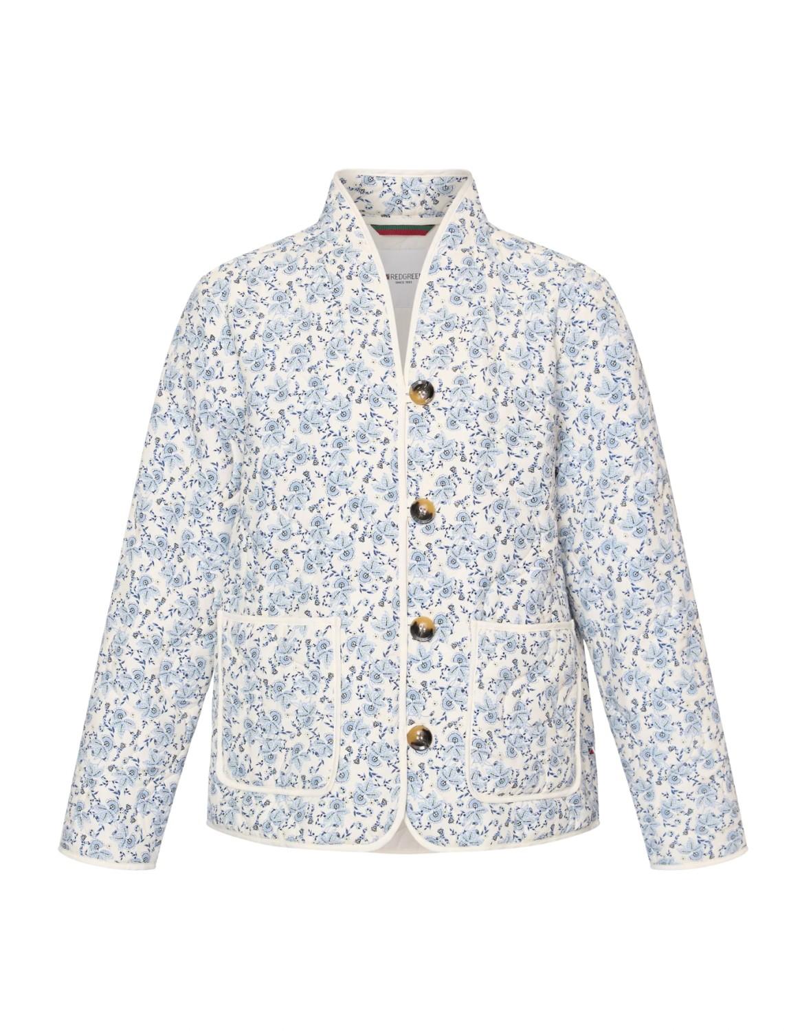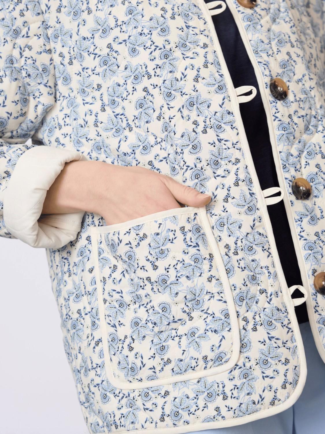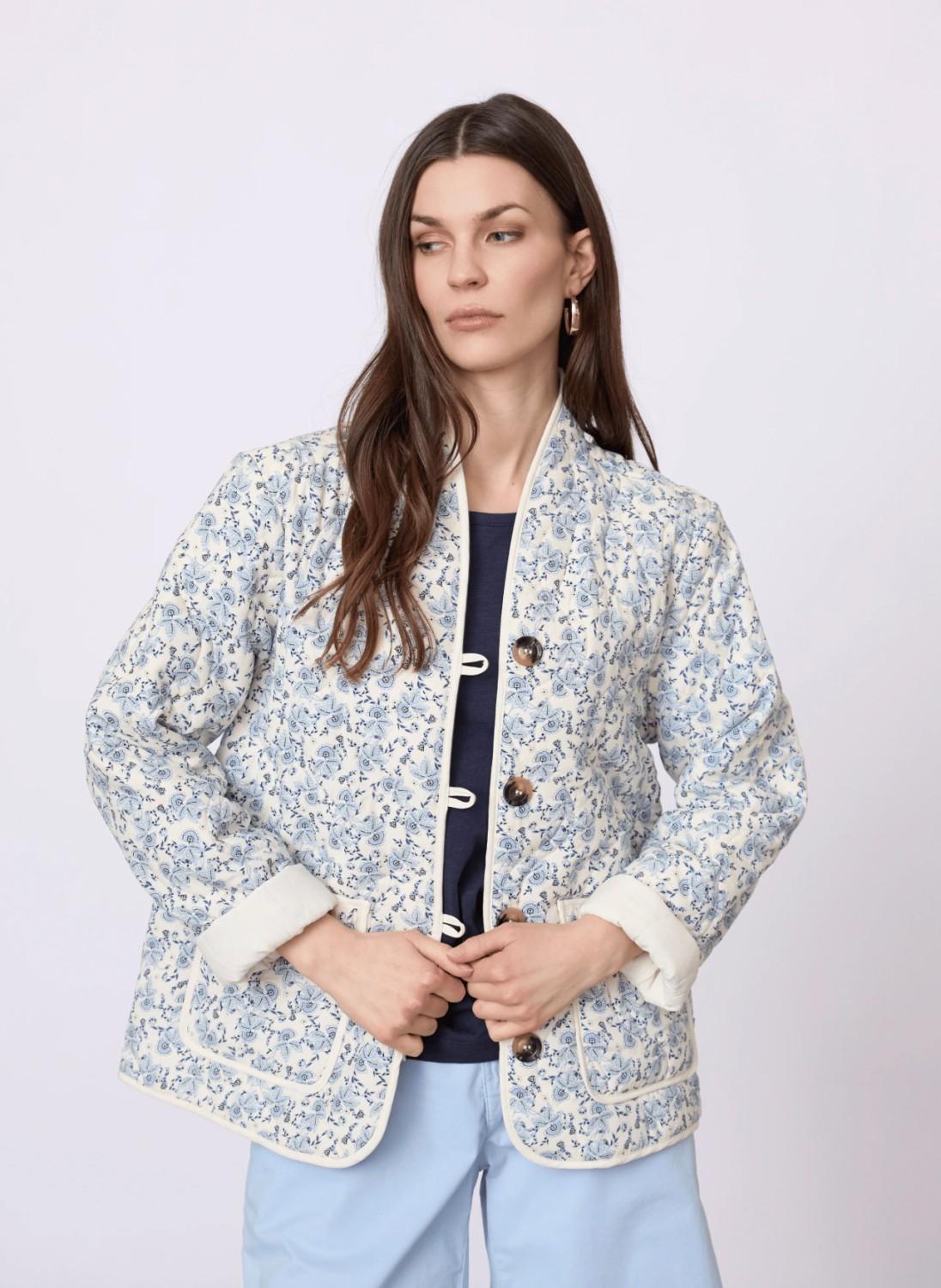 En fin quiltet jakke med nydelig blomsterprint. Den har rund hals og knappelukking foran.