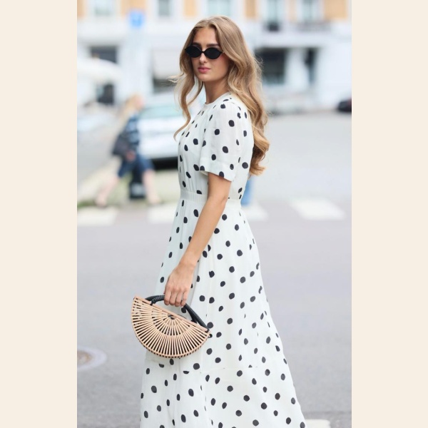 Nydelig kjole med et vakkert print av svarte prikker. Denne kjolen fremhever dine beste sider og gir deg en sofistikert look uansett naledning.