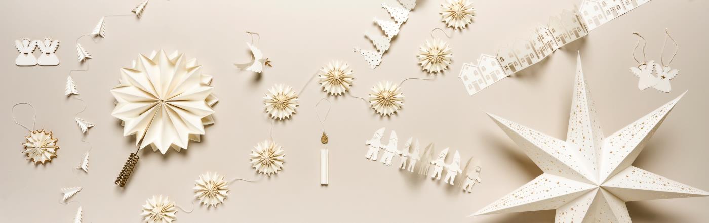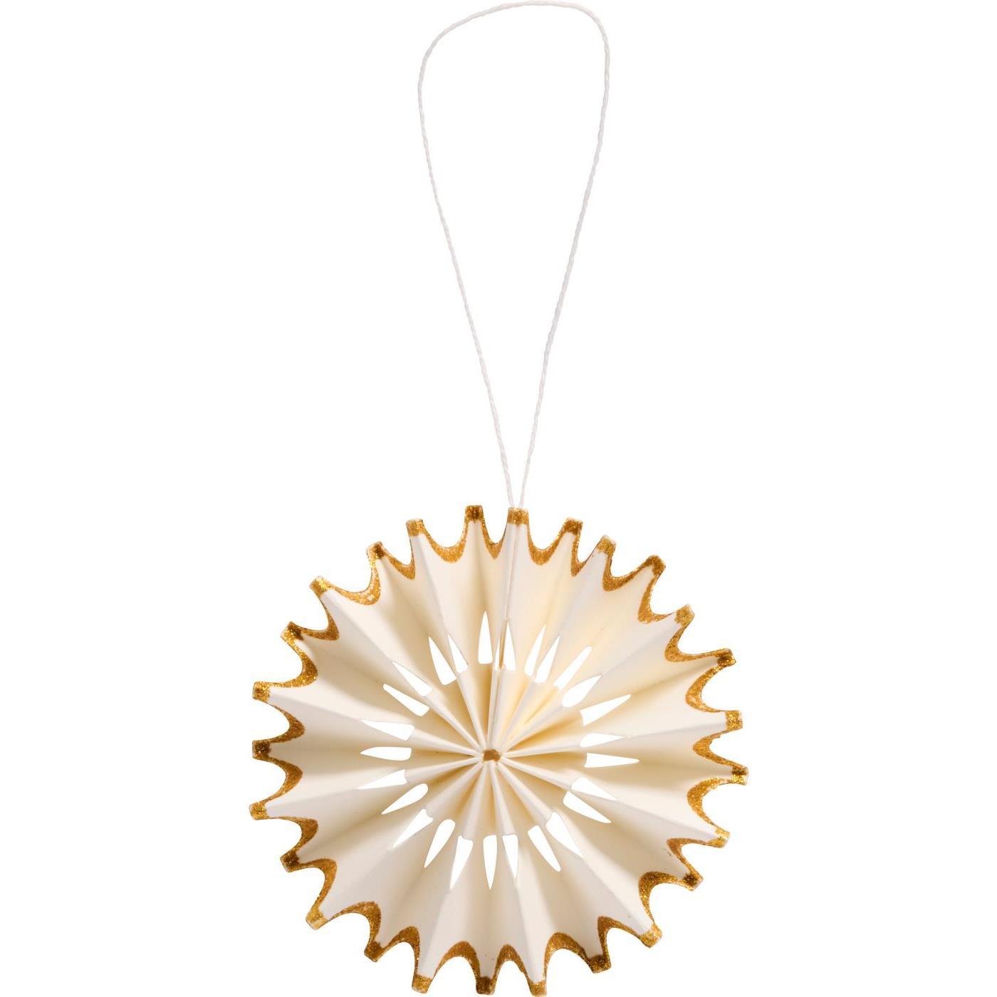 Snøfnugg laget i papir med en gullkant. En delikat og elegant juledekorasjon. Pynt opp i vindu, på en kvist eller juletreet.
